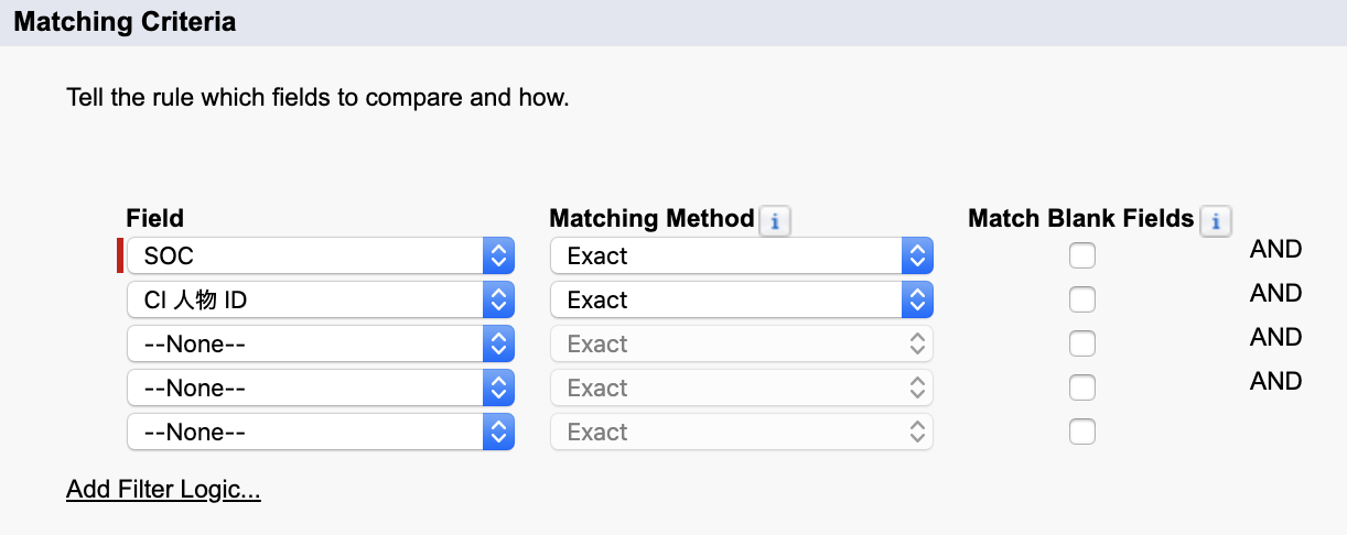 *For matching criteria for a contact or lead object, use SOC(システム) and CI Person ID(システム) for the Field and Exact for the Matching Method.