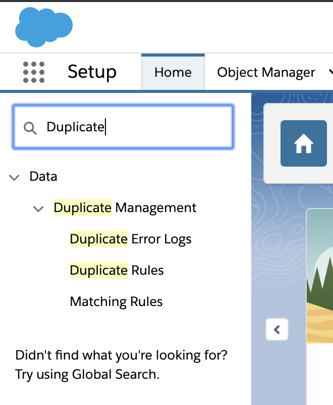 1. In the Salesforce settings screen, search for Duplicate and click Duplicate Rules.