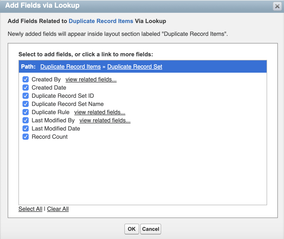 6. Select Duplicate Record Items Fields from the pulldown menu, and click Add fields related via lookup.