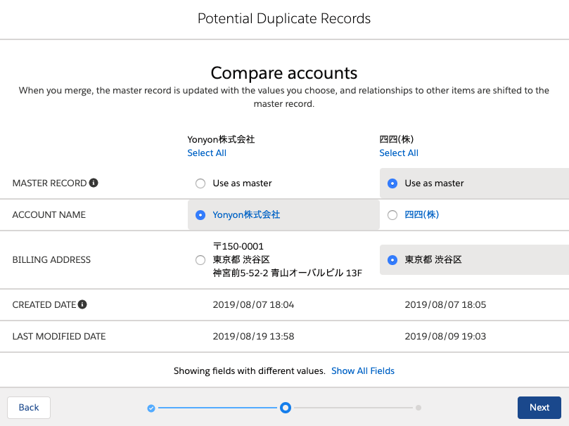 4. Select the field value that will become the master after merging duplicate records and click Next.