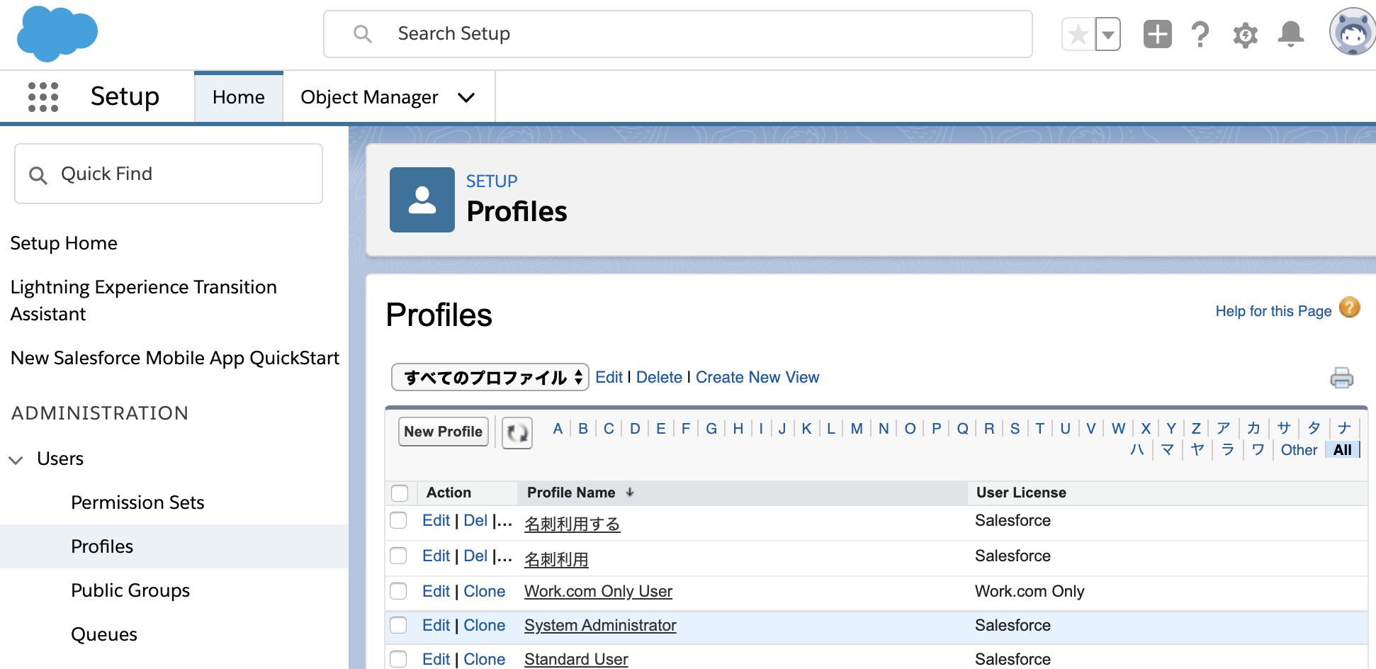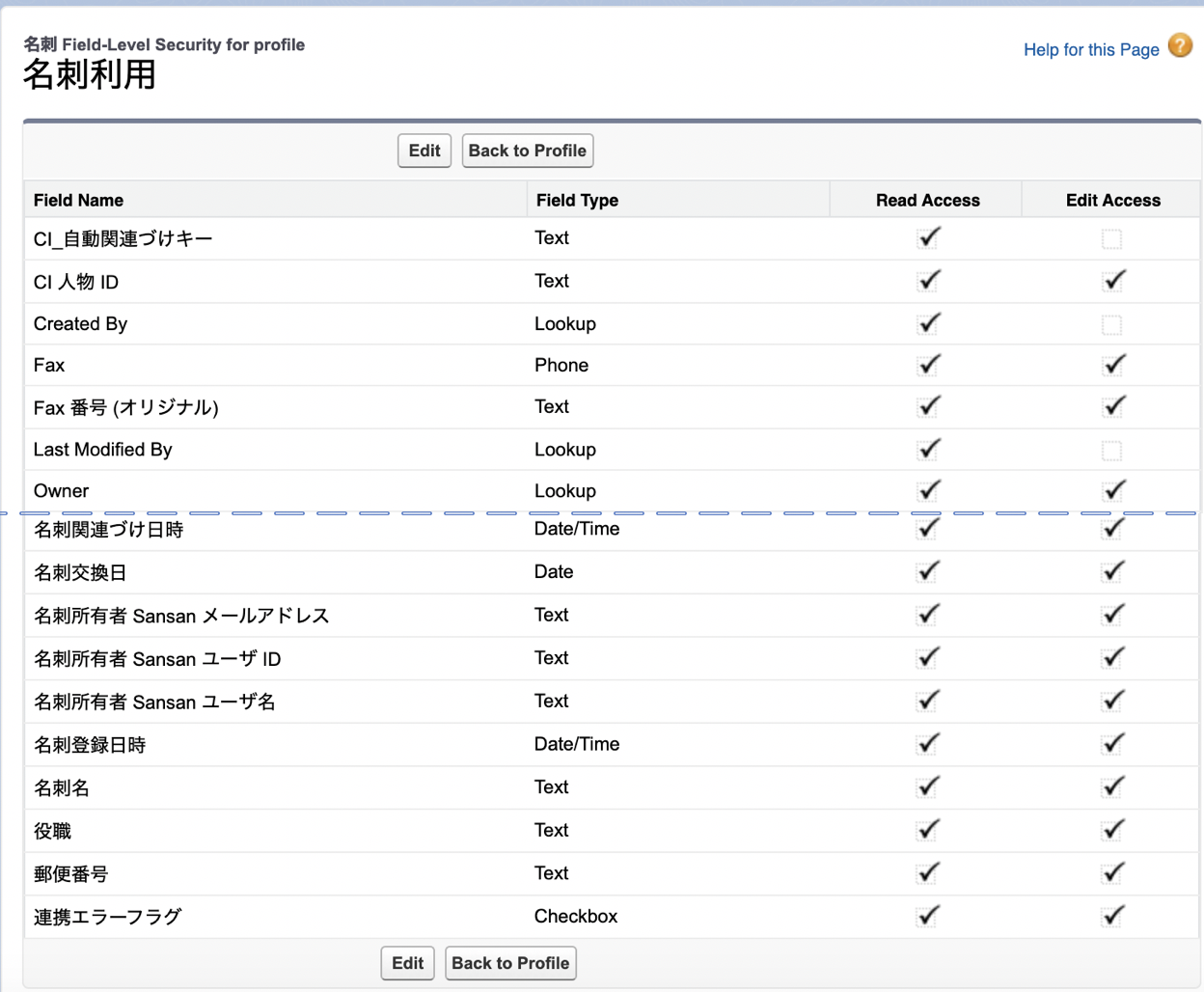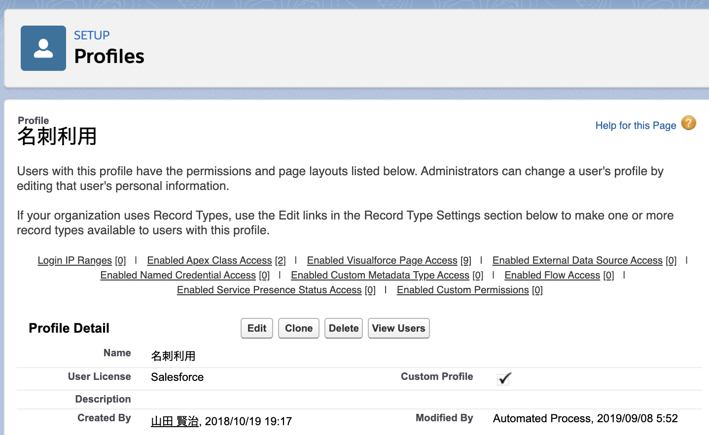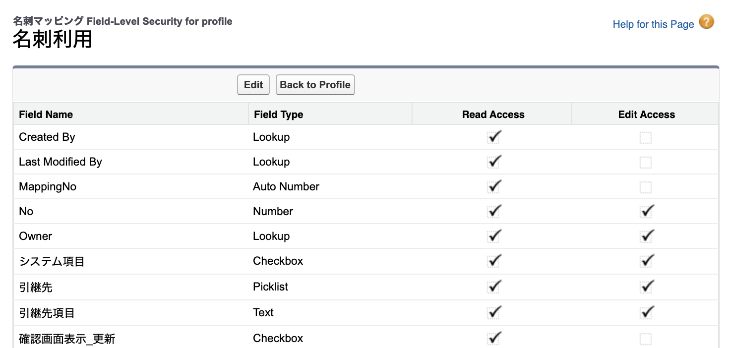 When you open the profile details, a Custom Profile will have that item checked. In this example, we will explain by using the “名刺利用” profile which was created by copying the standard user profile.