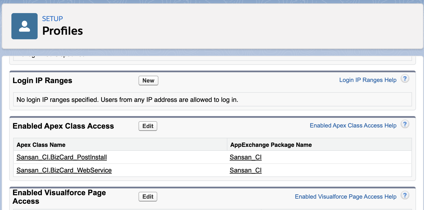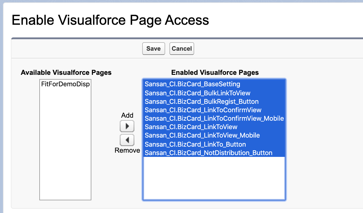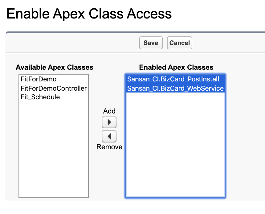 2. Add "Sansan_CI.BizCard_PostInstall" and "Sansan_CI.BizCard_WebService" from Available Apex Classes to "Enabled Apex Classes" on the right, and click "Save".