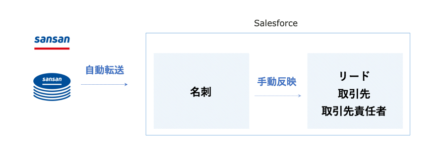 Salesforce Limited連携では、Sansanに取り込まれた名刺データをSalesforceへ転送し、名刺情報を連携することが可能です。Sansanの名刺データをもとにSalesforceの[名刺]オブジェクトが作成され、そこから取引先・取引先責任者またはリードオブジェクトへ関連づけることができます。
