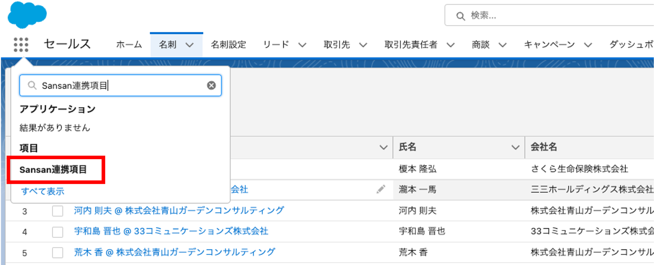 1. Salesforce へシステム管理者でログインし、アプリケーションランチャーで「Sansan連携項目」を検索して、クリックします。