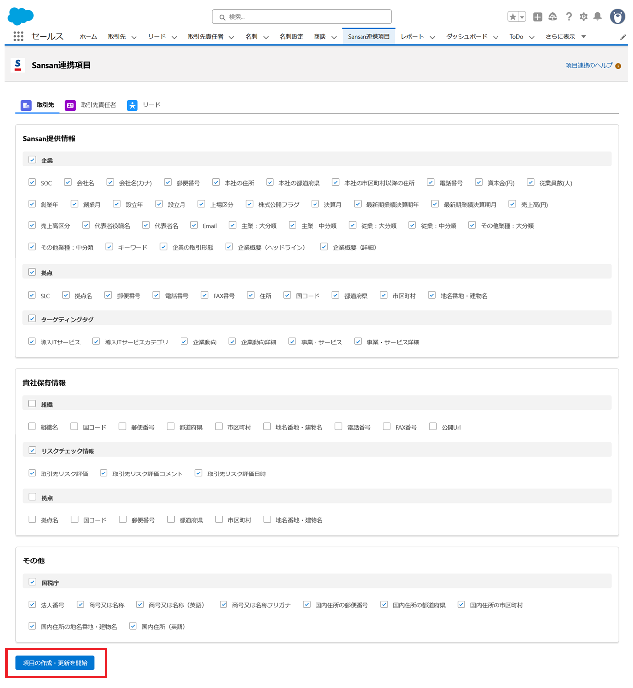 3.カスタム項目として追加したい項目にチェックを入れて、画面左下の[項目の作成・更新を開始]ボタンをクリックします。