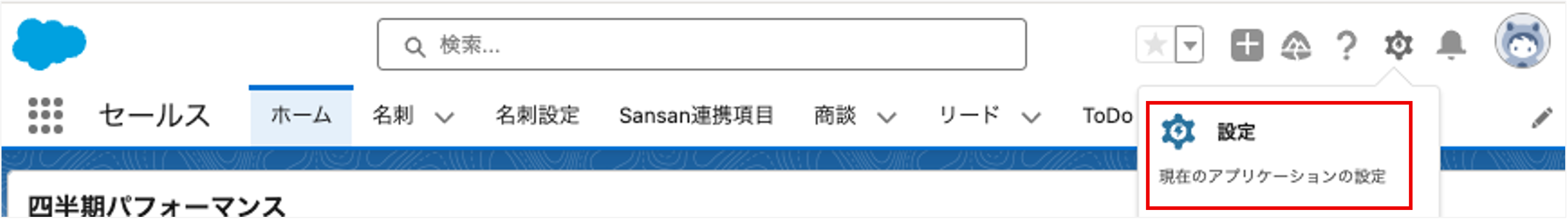 1. Salesforce へシステム管理者でログインし、画面右上の歯車アイコンから、[設定]をクリックします。