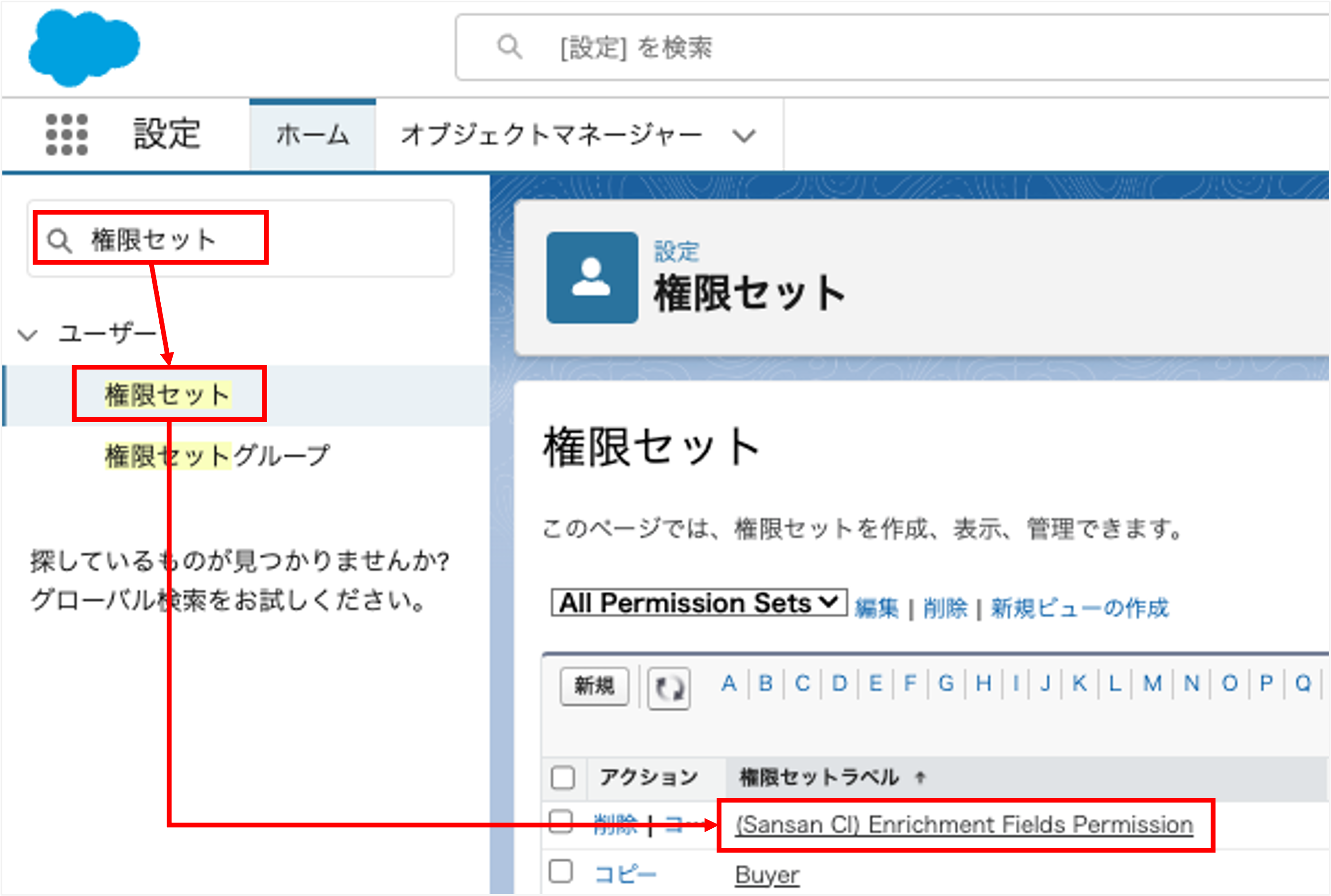 2. [クイック検索]に「権限セット」と入力し、「権限セット」→ [(Sansan CI) Enrichment Fields Permission]の順でクリックします。