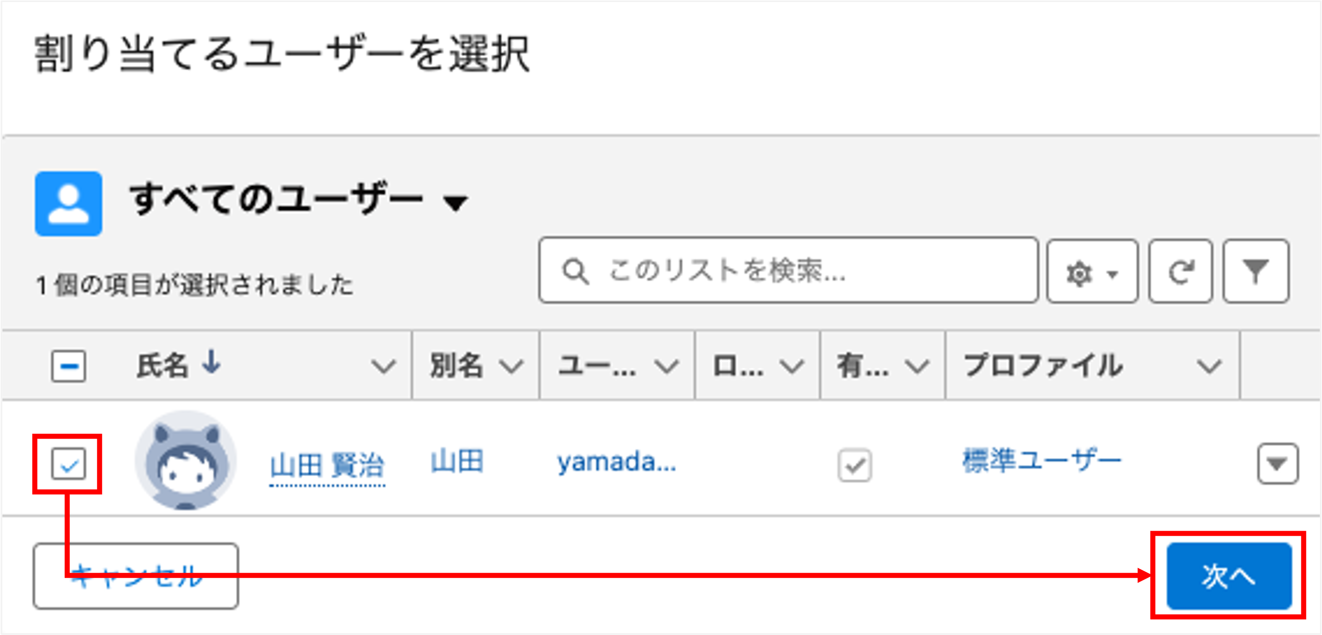 4. ユーザの一覧が表示されるので、以下のユーザを選択し、[次へ]をクリックします。
