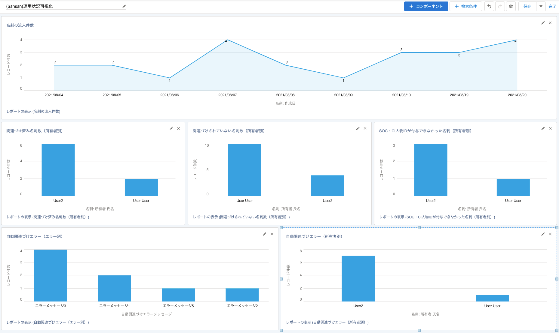Sansanが用意しているダッシュボードには、下記グラフ(コンポーネント)がデフォルトで表示されています。
