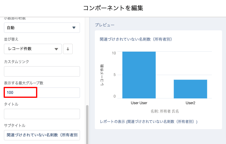 エラー別・所有者別に表示されているコンポーネント(例:「関連づけされていない名刺数(所有者別)」)は、デフォルトで最大100グループまで表示されます。
