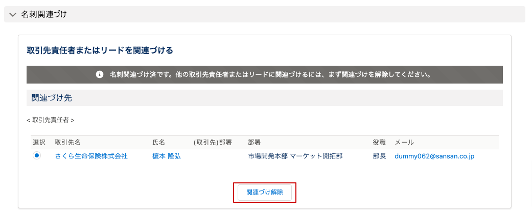 1. 「名刺関連づけ」セクションから、「関連づけ解除」をクリックします。