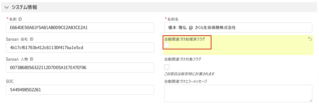 2. 「システム情報」セクションにある「自動関連づけ処理済フラグ」のチェックを外します。