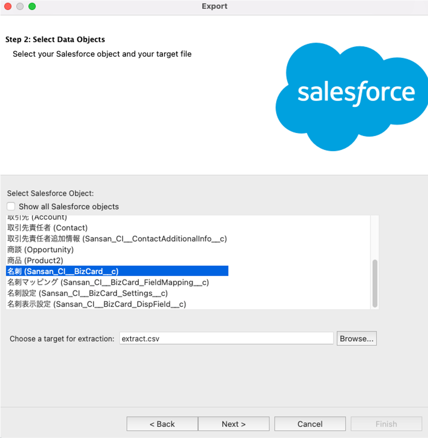 2. 「Export」を選択後、名刺オブジェクト(Sansan_CI__BizCard__c)のデータをエクスポートします。