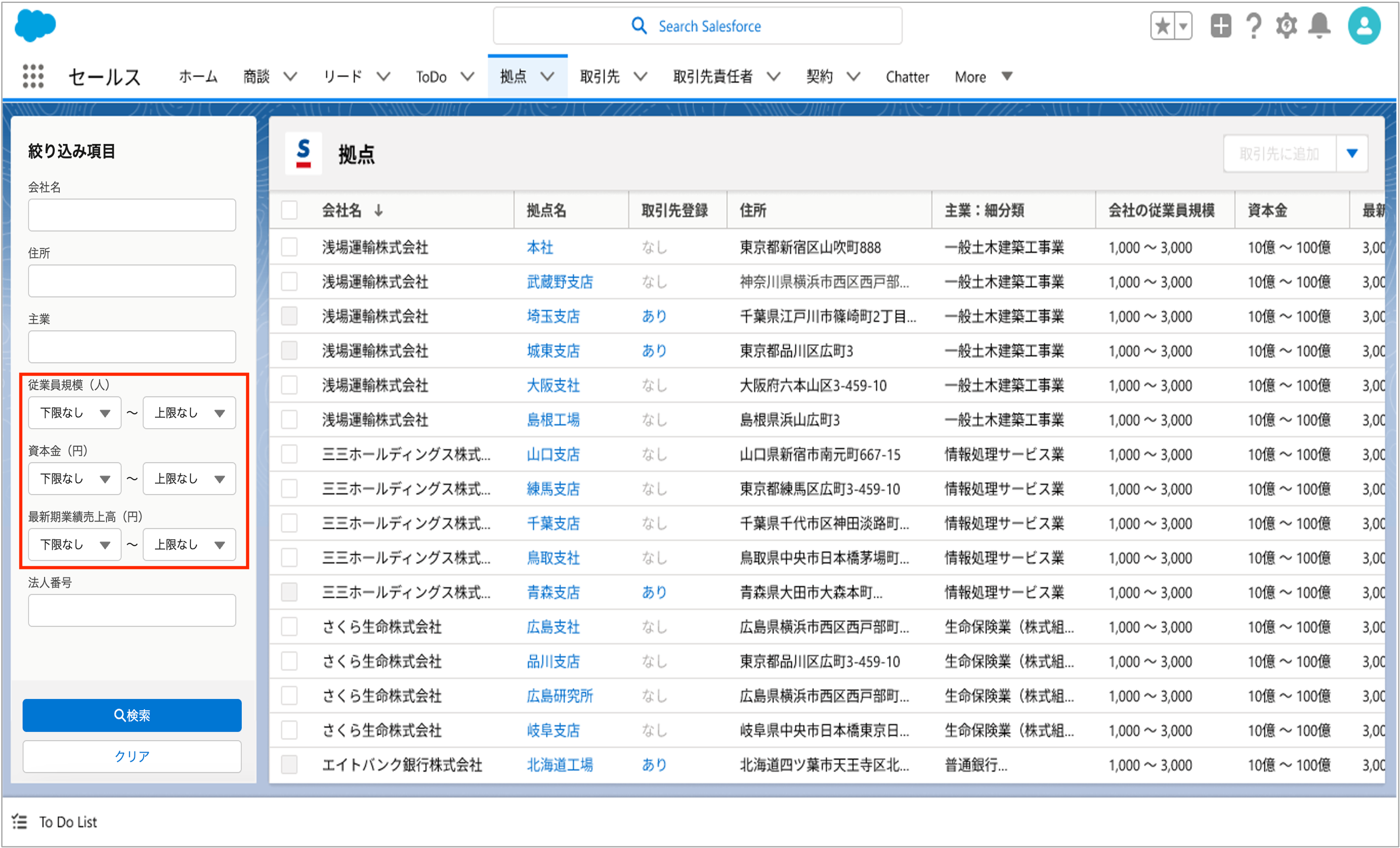 拠点リストにおいて、絞り込み項目の「従業員規模(人)」「資本金(円)」「最新期業績売上高(円)」を上限・下限で絞り、検索できるようになりました。より細かくターゲットを絞り込み、取引先に追加することが可能になります。