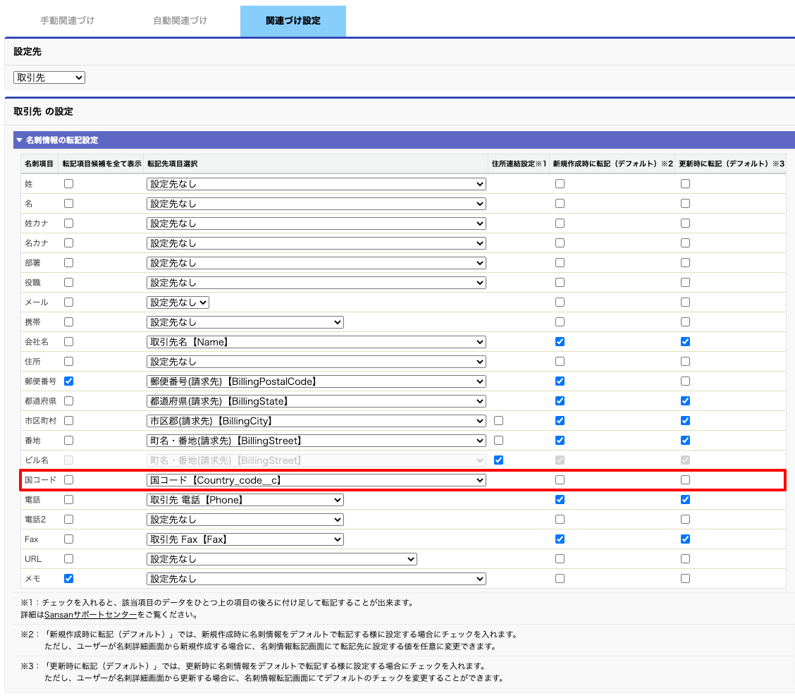 ※Sansan_CIパッケージのバージョン1.40以下をご利用のお客様については、国コード情報の反映のために弊社側の設定作業が必要です。