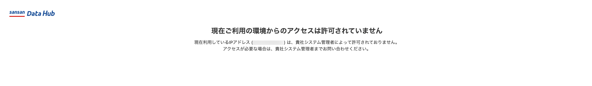 許可されていないIPアドレスからSansan Data HubのWeb画面にアクセスされた場合、以下のメッセージが表示されます。この場合、現在ご利用の環境からのアクセスは許可されていません。