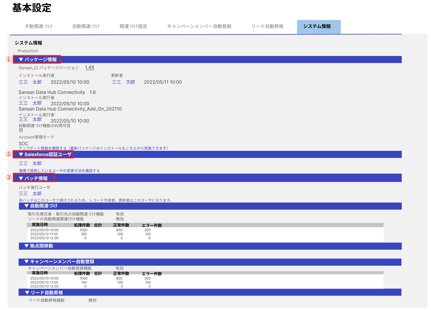 | ①パッケージ情報 | Sansan_CIパッケージのインストール済みのバージョン、インストールを行ったユーザーなどを確認できます。 |